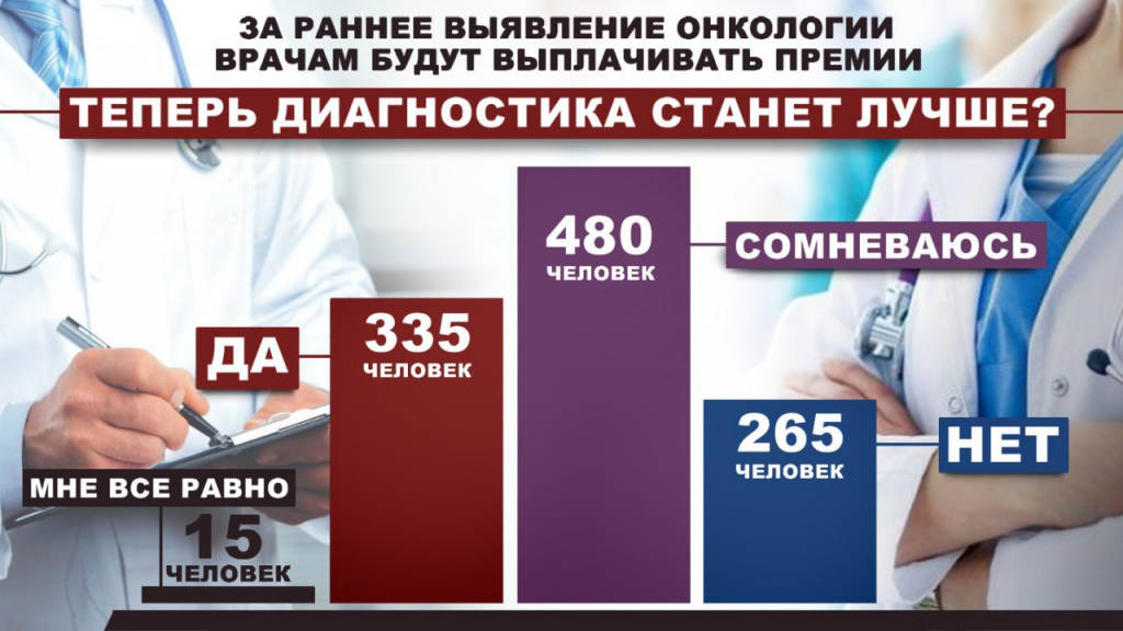 Как мы уже сообщали, Госдума приняла закон, который предусматривает премий врачам за выявление онкологических заболеваний на ранних стадиях. В связи с этой новостью мы провели в социальных сетях опрос, в котором спросили мнения наших читателей о том, на сколько данная инициатива поможет увеличить качество врачебной диагностики. Большинство ответили, что сомневаются в эффективности нового закона и диагностика останется на прежнем уровне.