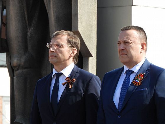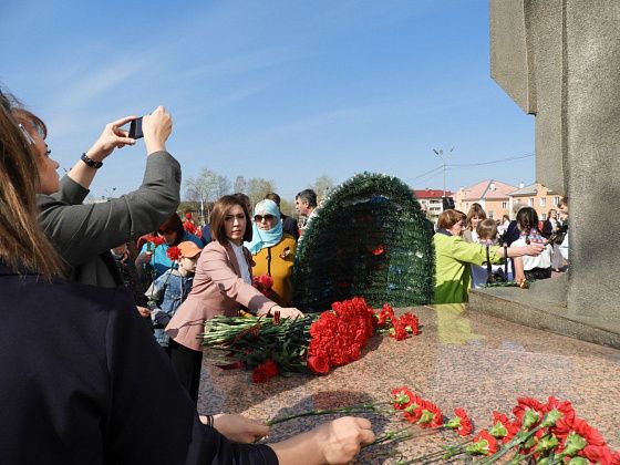 Далее — возложение цветов к обелиску Славы. Самый большой венок к мемориалу поднесли Андрей Клопов и Евгений Преин. Следом за ними по площади растянулась целая очередь, чтобы положить гвоздики к подножию памятника.