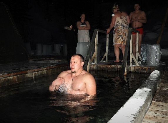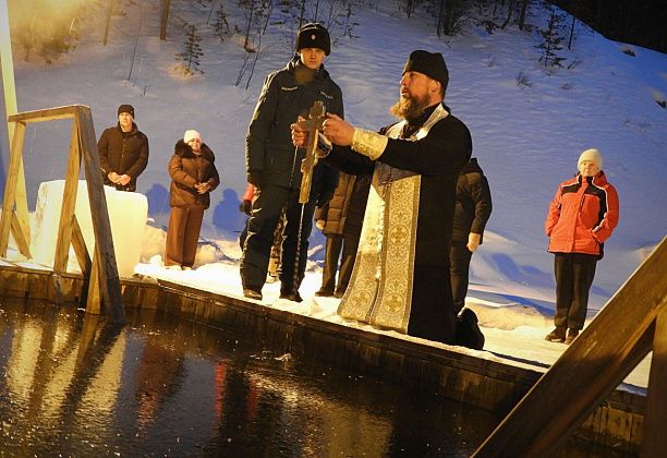 Прорубь была оборудована еще в 14.00. По традиции был установлен ледяной крест, палатка для переодевания. А вокруг купели положены деревянные трапы. По словам работников 266 ПСЧ, до обряда освящения в прорубе никто, за редким исключением, не искупался.